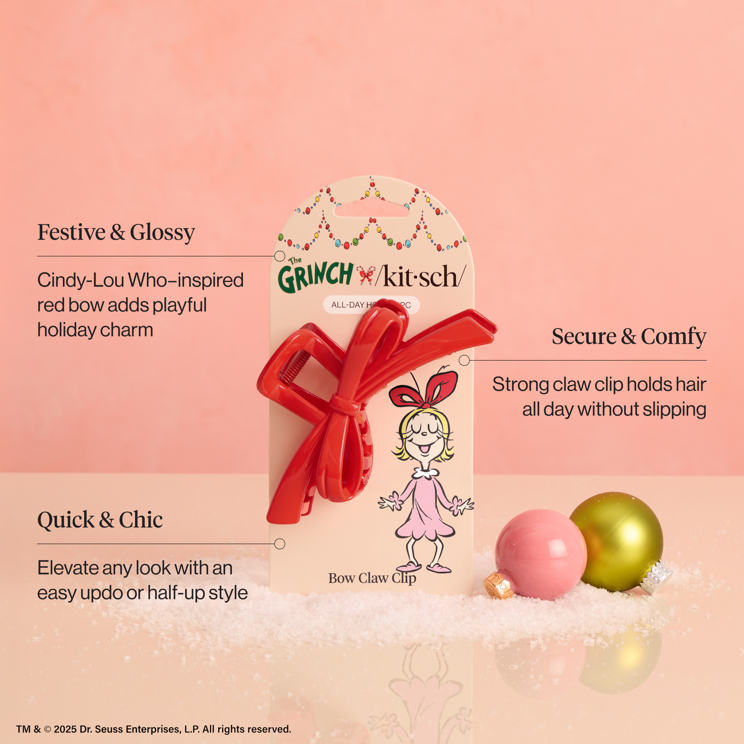 - Glossy red bow design inspired by Cindy-Lou Who’s signature style.